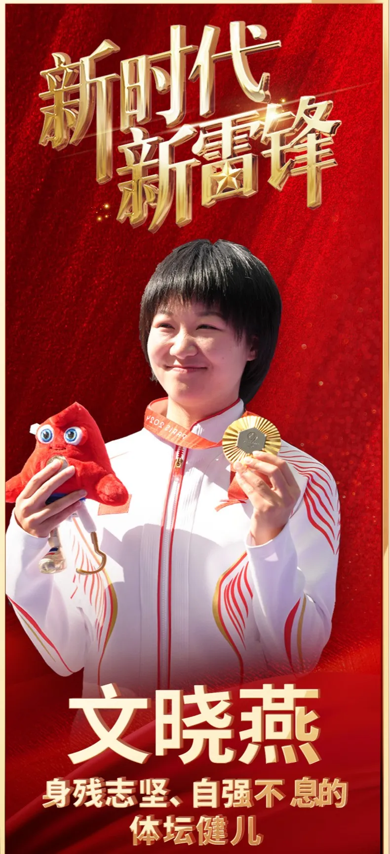 凭借不懈拼搏与顽强坚韧,文晓燕从默默奔跑的追风少女,成长为闪耀世界体坛的冠军选手。她不仅是身残志坚、自强不息的青春榜样,更是积极进取、为国争光的新时代体育健儿。她的奋斗历程,生动诠释了“新时代新雷锋”的精神内涵——在平凡中坚守,在拼搏中奉献,在砥砺中照亮他人。